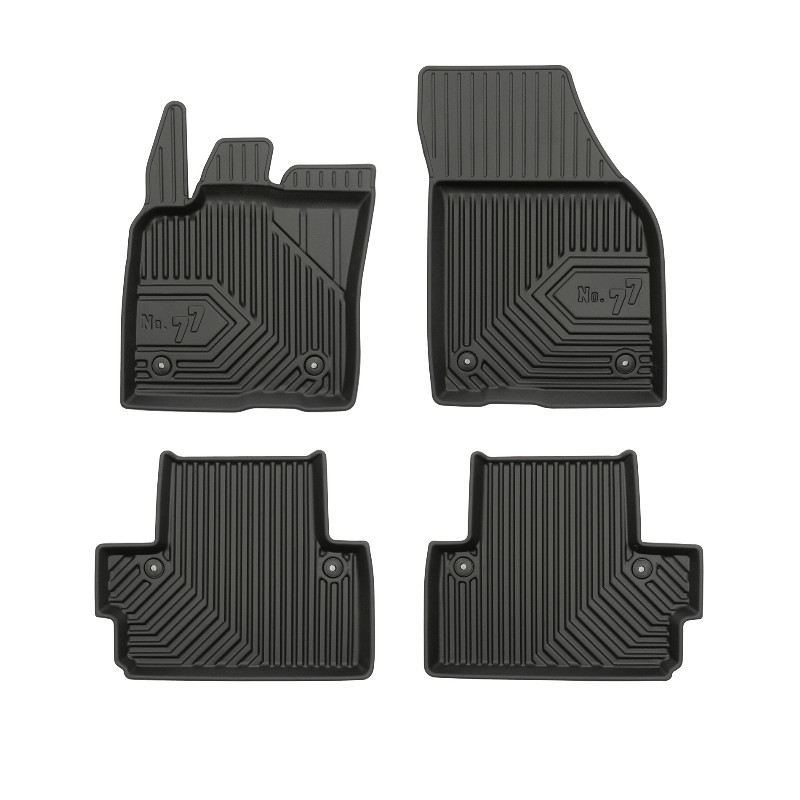 Augsta līmeņa aizsardzība jūsu automašīnai, paklājiņi ideāli pieguļ un lieliski pieguļ salona grīdai. Moderns un funkcionāls dizains, kā arī augsta mala garantē efektīvu ūdens un netīrumu savākšanu un novērš to noplūdi. Tas uztur automašīnas salonu tīru. Izgatavoti no augstas kvalitātes gumijas, kas nesatur toksiskas sastāvdaļas. Bez smaržas. Paklājiņiem ir klipši, tāpēc tos ir viegli piestiprināt pie grīdas. Gumijas paklājiņi saglabā savu elastību pat pie temperatūras izmaiņām. Īpašā virsma neļauj paklājiņiem slīdēt braukšanas laikā, kas ievērojami ietekmē drošību un braukšanas komfortu.