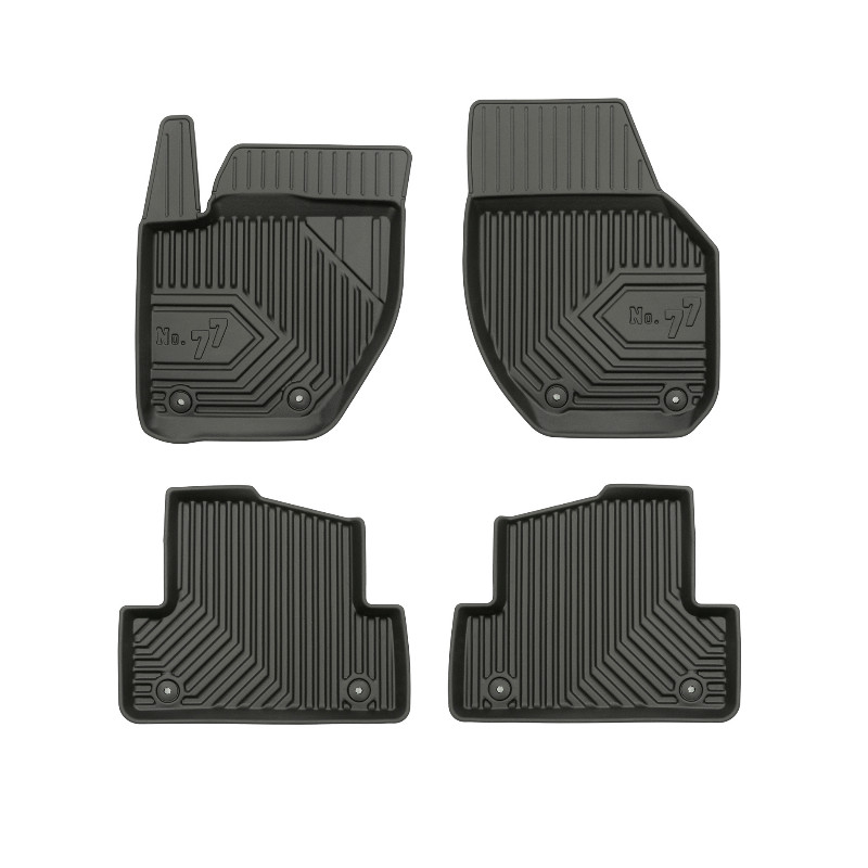 Augsta līmeņa aizsardzība jūsu automašīnai, paklājiņi ideāli pieguļ un lieliski pieguļ salona grīdai. Moderns un funkcionāls dizains, kā arī augsta mala garantē efektīvu ūdens un netīrumu savākšanu un novērš to noplūdi. Tas uztur automašīnas salonu tīru. Izgatavoti no augstas kvalitātes gumijas, kas nesatur toksiskas sastāvdaļas. Bez smaržas. Paklājiņiem ir klipši, tāpēc tos ir viegli piestiprināt pie grīdas. Gumijas paklājiņi saglabā savu elastību pat pie temperatūras izmaiņām. Īpašā virsma neļauj paklājiņiem slīdēt braukšanas laikā, kas ievērojami ietekmē drošību un braukšanas komfortu.