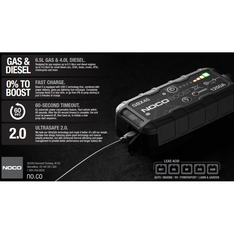 GBX45 ir kompakta, spēcīga 12V 1250A litija palīgierīce dzinēja iedarbināšanai gadījumos, kad ir izlādējies akumulators. Atkarībā no gaisa temperatūras GBX45 iesaka benzīna un dīzeļdzinējiem ar tilpumu līdz attiecīgi 5 un 3 litriem. Piemērots automašīnu, motociklu, kravas automašīnu, ATV, laivu, RV, furgonu, SUV, traktoriņu un citu transporta līdzekļu iedarbināšanai.